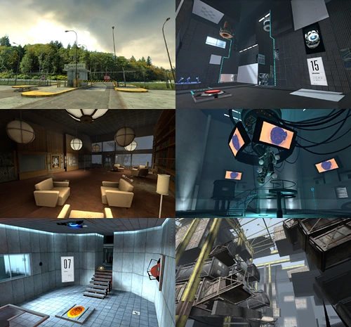 Aperture Science Extended Relaxation Center • Parcours de test de GLaDOS (Portal) • Central AI Chamber • Incinerator Room • Parcours de test de GLaDOS (Portal) • Parcours de test de GLaDOS (Portal 2) • Turret Manufacturing • Employee Daycare Center • Neurotoxin Generator • Central AI Chamber • Test Shaft 09 • Parcours de test de Wheatley • Central AI Chamber • Lune • Central AI Chamber • Turret Opera